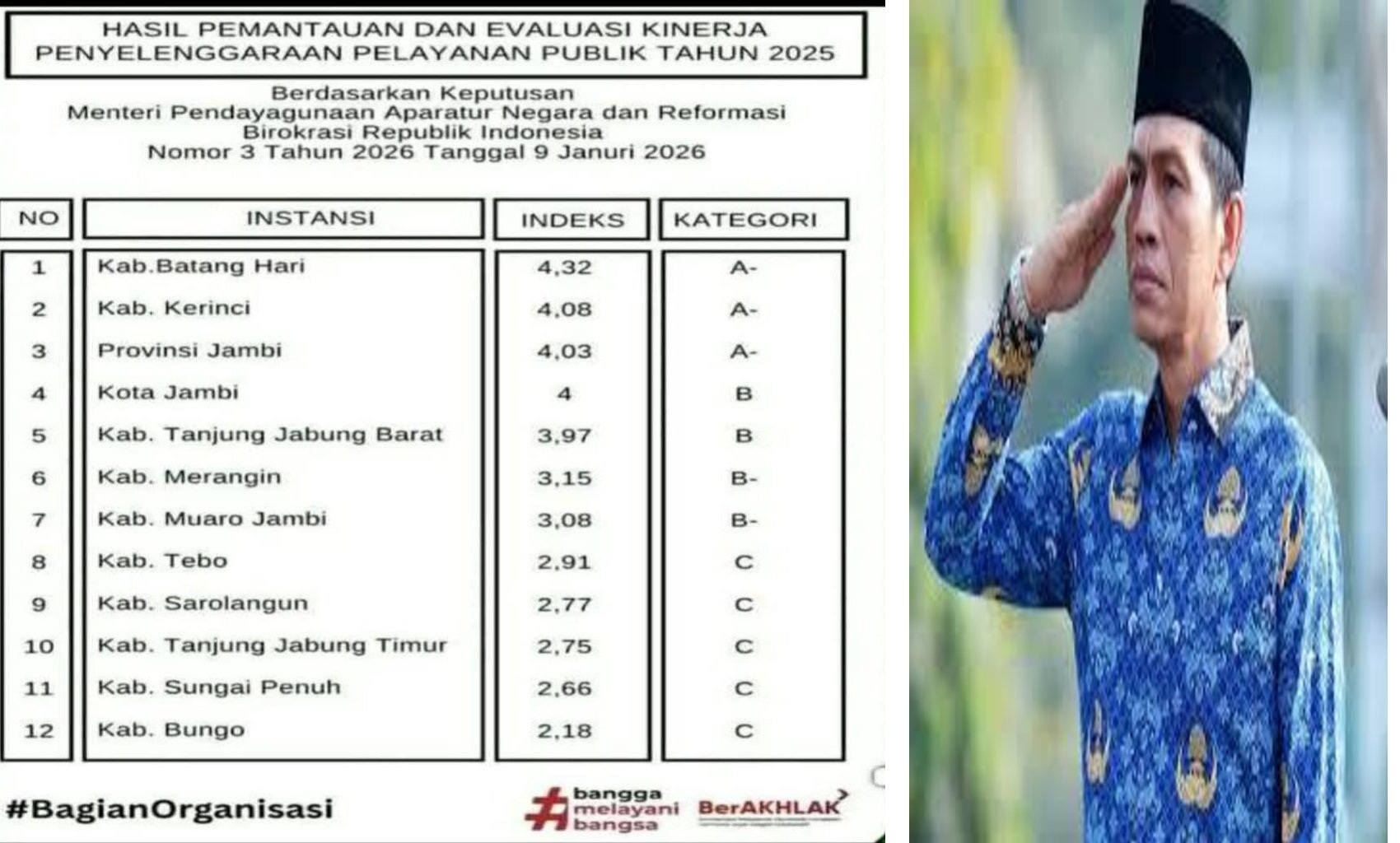 “Alhamdulillah, berdasarkan penetapan Kementerian PANRB, Kabupaten Batanghari dinyatakan sebagai Kabupaten/kota se provinsi Jambi dengan kinerja pelayanan publik terbaik tahun 2025. Ini bukan sekadar prestasi, tetapi amanah untuk terus menjaga dan meningkatkan kualitas pelayanan kepada masyarakat,” kata Fadhil Arif di Muaro Bulian, Senen (12/1).